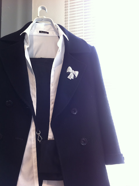 Pantalón pitillo negro, camisa blanca, mis bailarinas de leopardo nuevas, bolsito pequeño cruzado negro (¡gracias mamá!) y una de mis piezas más queridas: un abrigo totalmente 'vintage' que heredé de mi abuela y que, tras pasar por la modista para adaptarlo a mi talla, me ha sacado de mil apuros (esta vez le coloqué un gracioso broche 'lazo' que encontré en H&M)